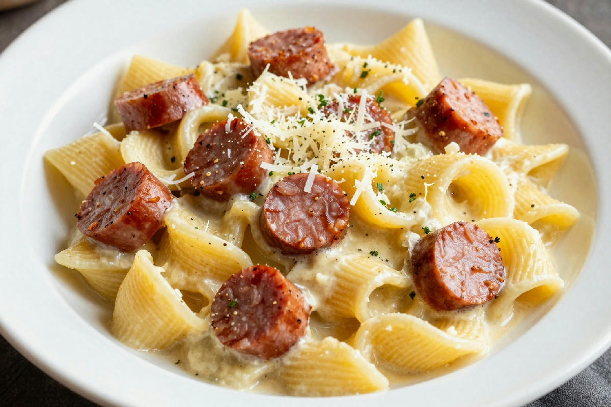 Pasta con crema di patate, salsiccia e un tocco di formaggio fresco per un piatto gustoso e nutriente